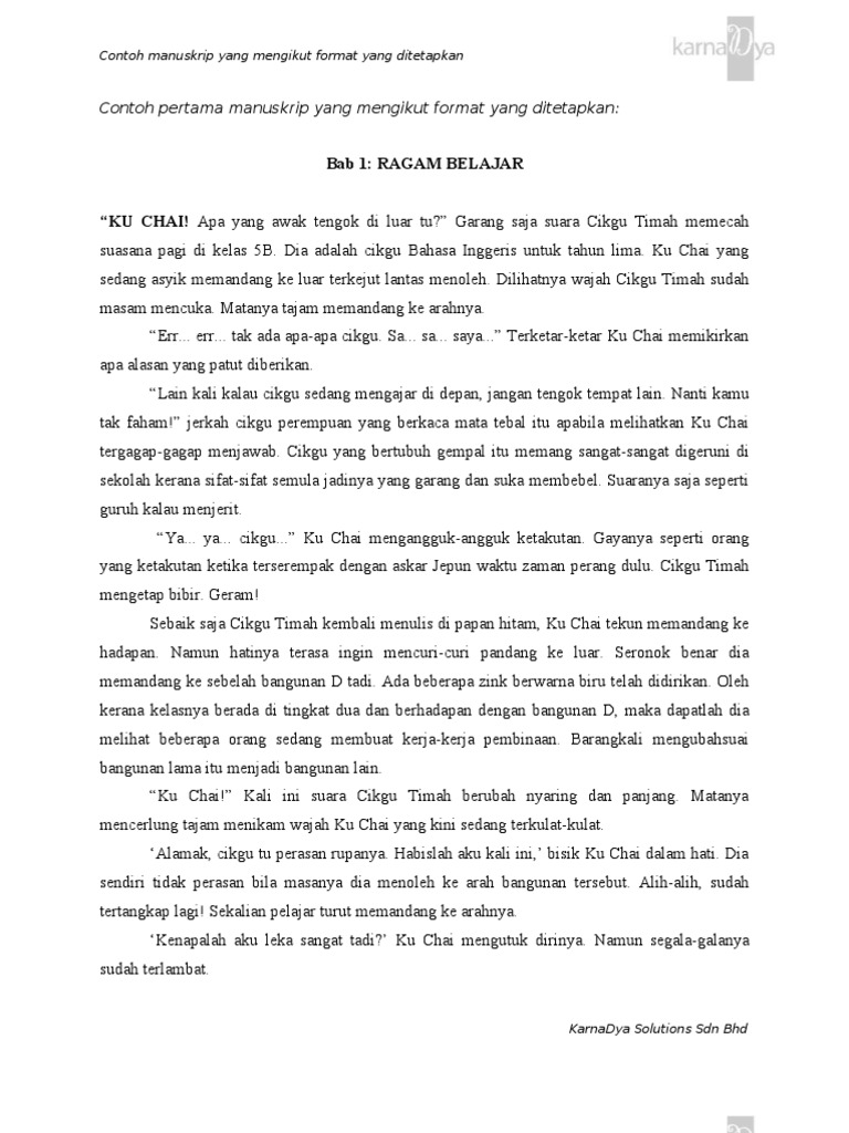 Contohnya novel Pelangi saya mengisahkan kisah benar zaman kanak. Contoh manuskrip yang mengikut format yang ditetapkan. Rabu 17 Oktober 2012.